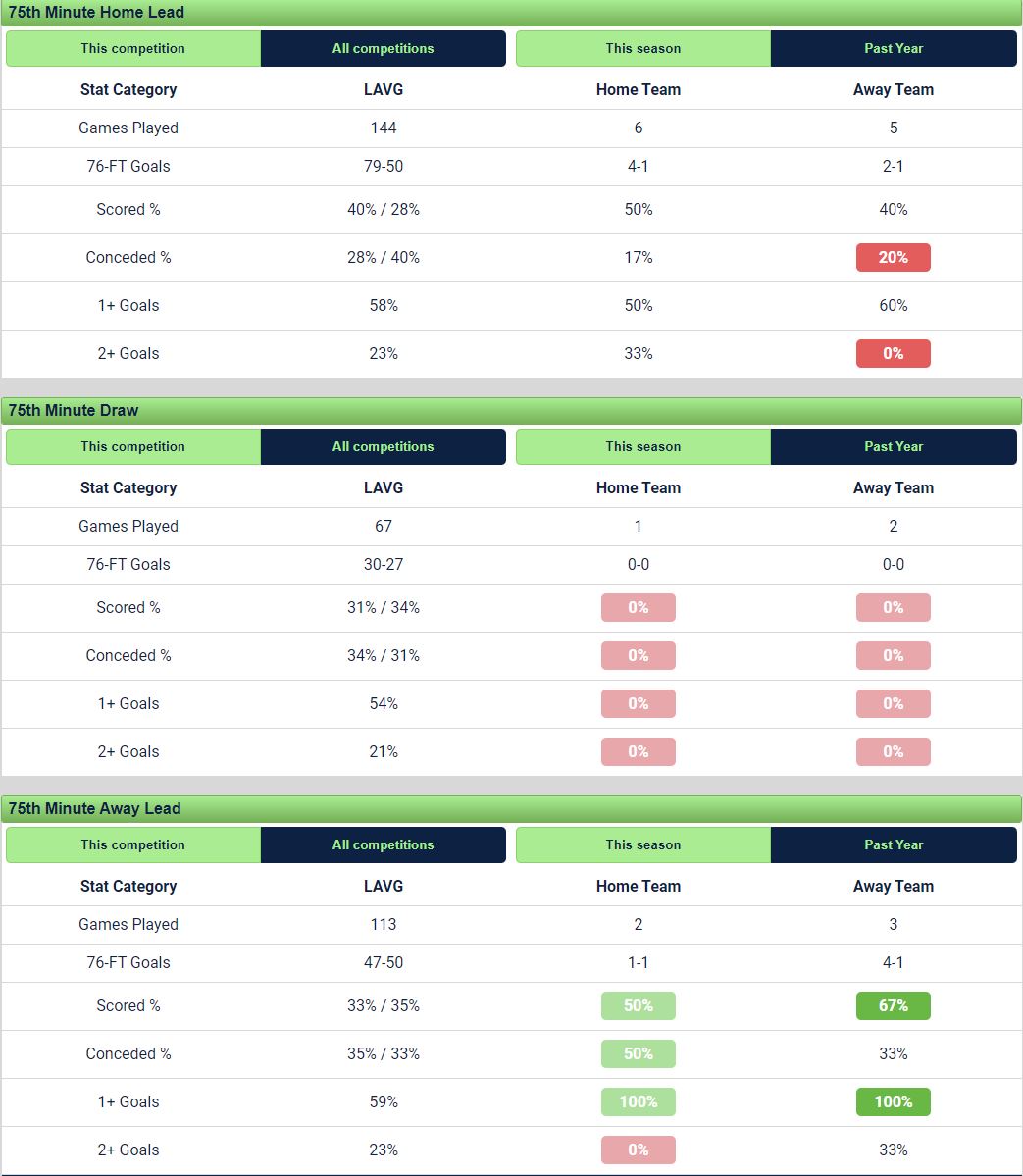 We at Goalstatistics provide match specific football stats for certain live trading or live betting spots. For late goals strategy, you can use our late goal stats which can be found under the 75th-minute tables. We break down the stats into 3 different categories: