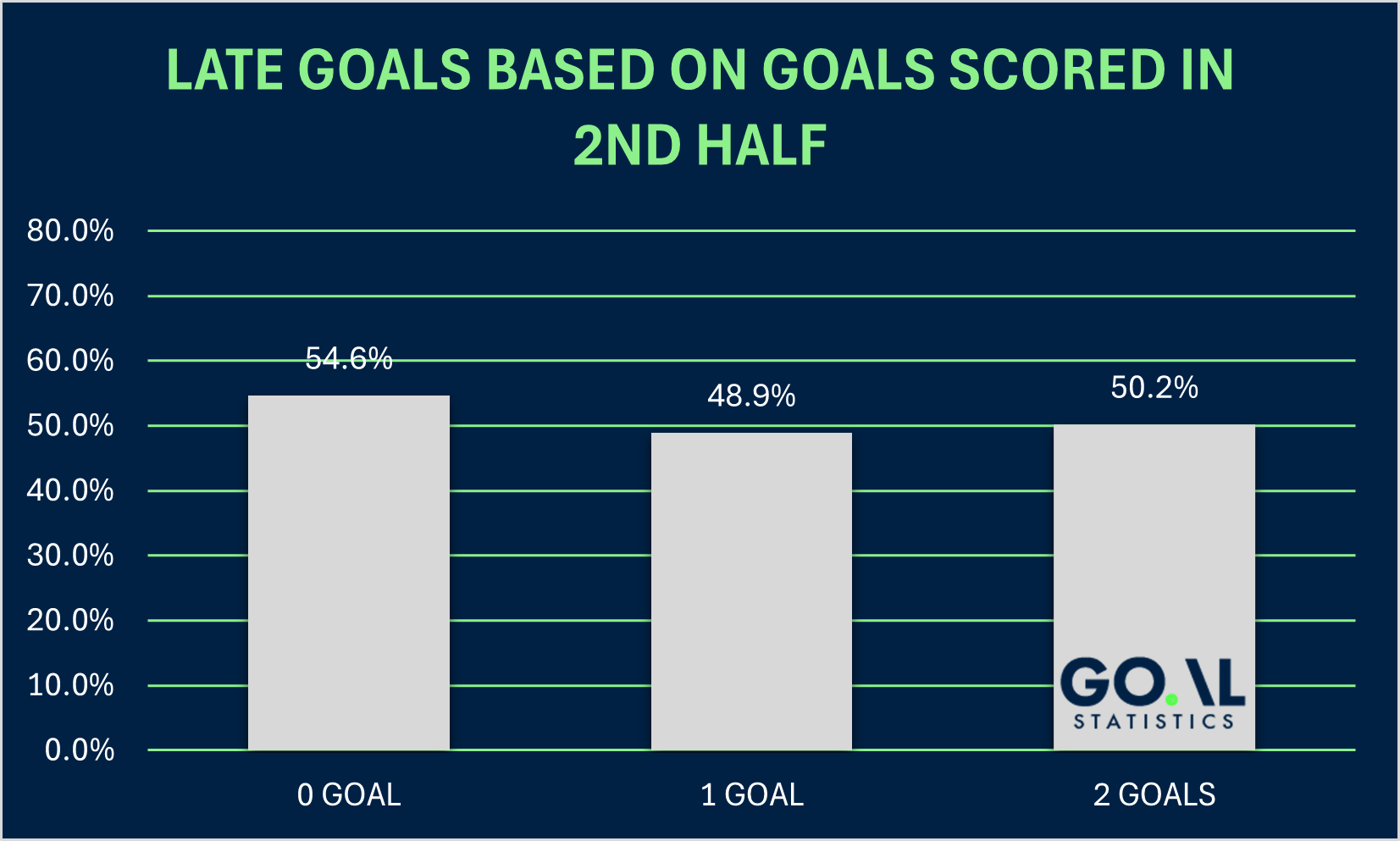 We at Goalstatistics provide match specific football stats for certain live trading or live betting spots. For late goals strategy, you can use our late goal stats which can be found under the 75th-minute tables. We break down the stats into 3 different categories: