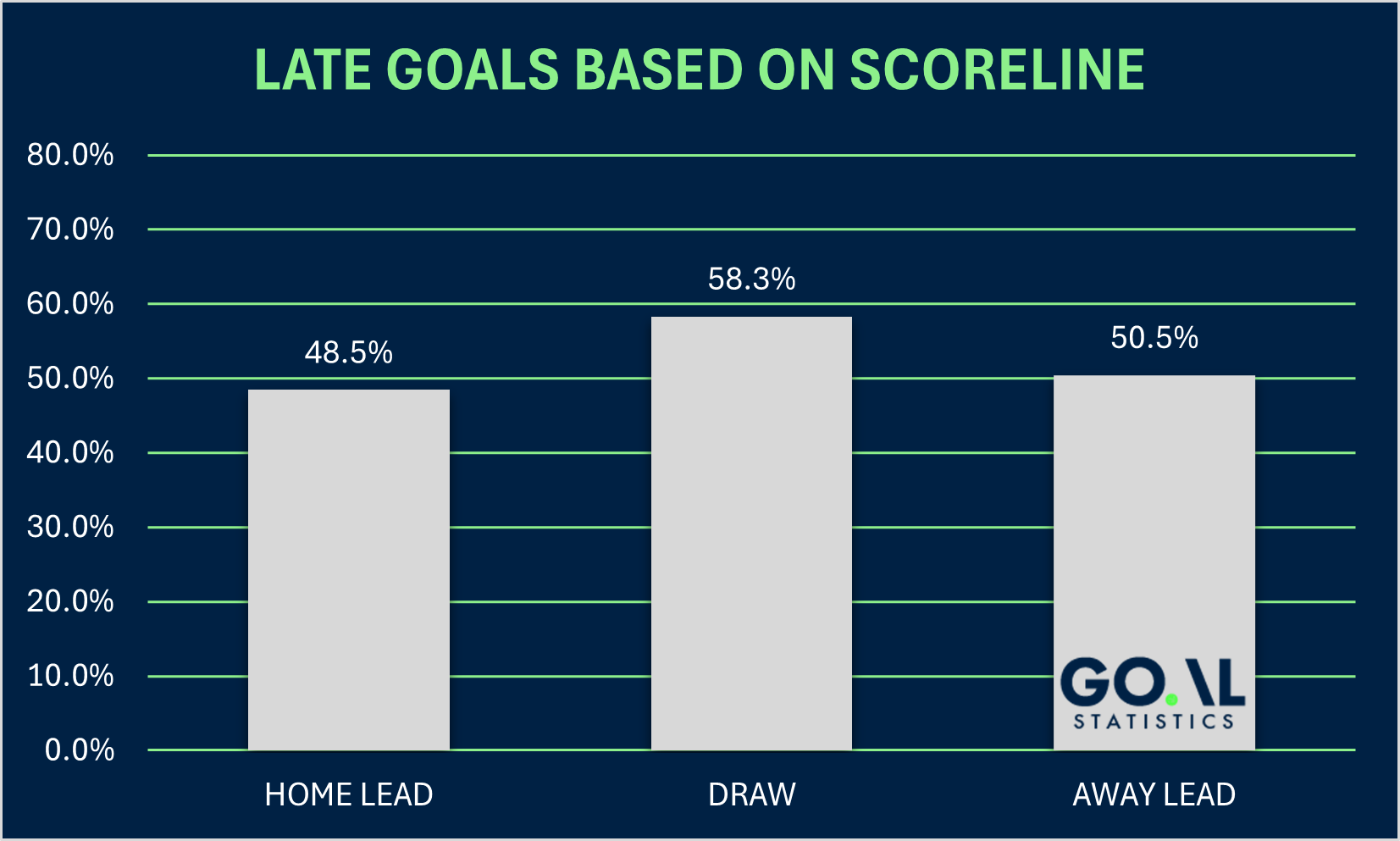 Regardless of the scoreline, there is at least one goal after the 70th minute more than half of the time! If we look at the 75th minute, it’s still above 50%. After the 80th minute, there is a bigger drop in terms of goal probability, as the teams managed to score ‘just’ 42.6% of the time. It’s still a lot, especially if you consider that there are only 10 minutes left from the regular time.